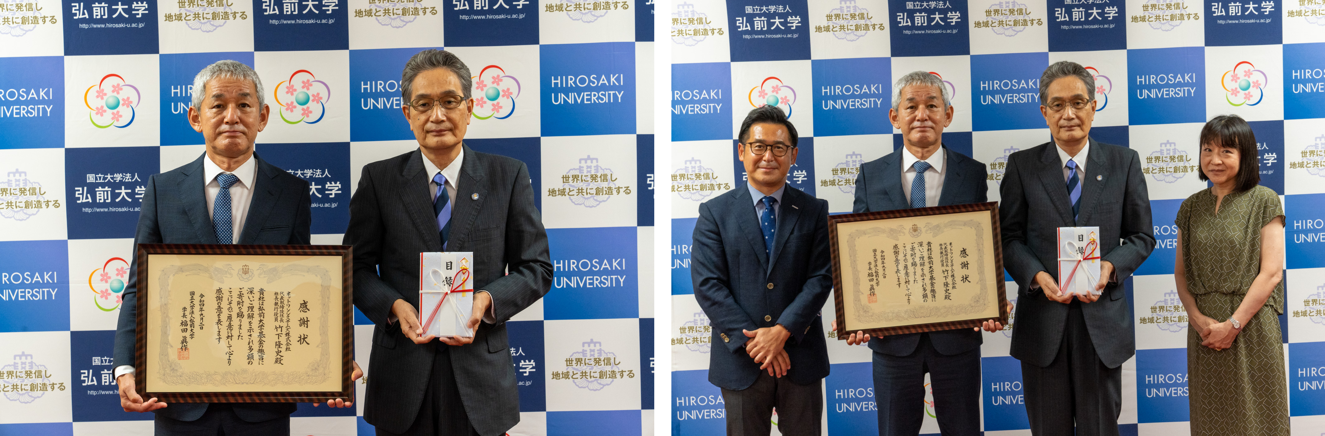 竹下代表取締役(左) と弘前大学 福田学長(右) 左から)上野執行役員、竹下代表取締役、弘前大学 福田学長、郡 理事/副学長