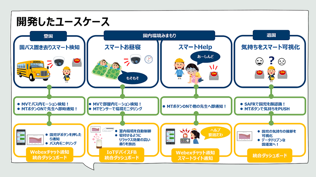 昨今の保育事故件数の増加を受けて、Meraki MVカメラや MTセンサーを使い保育園の登園から退園をサポートするソリューションを開発しました。Meraki MVカメラ MTセンサーのセンシングデータの取得をトリガーにWebex、あるいは3rd party製品で保育士や園児に通知やフィードバックを行うことで業務のサポート及び自動化を行います。また、取得したデータはダッシュボード上で一元的に管理できます。