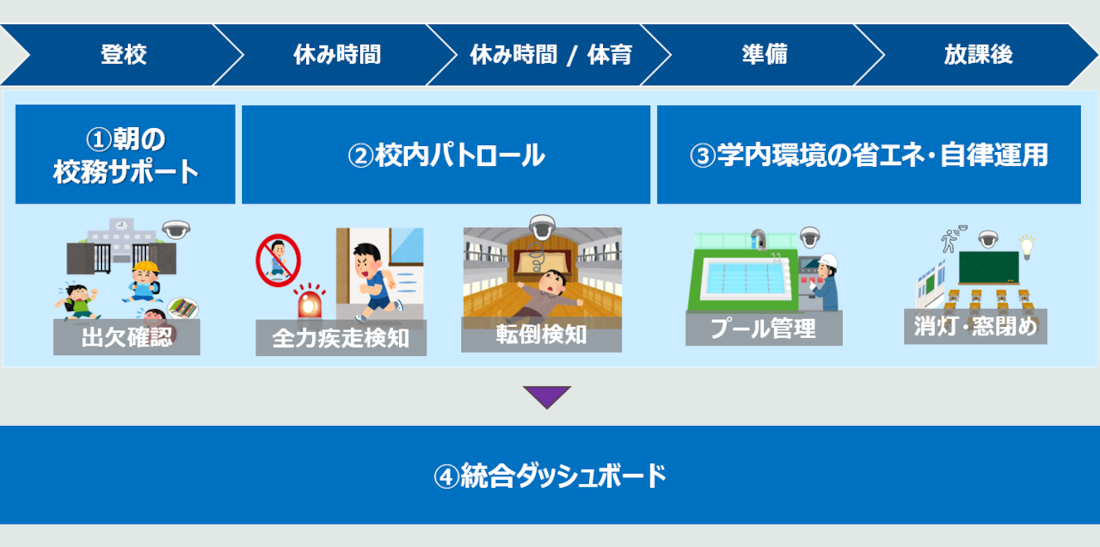 統合ダッシュボードでは各ソリューションで保存したデータを収集し、校内全体の状態を 1 つの画面で可視化します。
