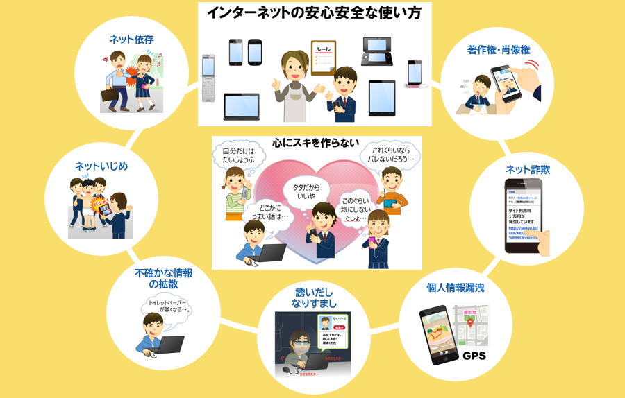 インターネットの安心・安全な使い方として、主な7つの題材に対して加害者にも被害者にもならないために気をつけるべき点や、普段の生活での心構えなどを、中高生、教職員、保護者に対して説明いたしました。