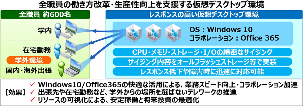 また、上智大学は従来からセキュリティ対策や運用効率化に向けて仮想デスクトップを導入していたものの、職員数の増加でレスポンスが低下しており、この側面でも改善が急務でした。