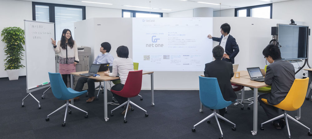 新しい中部支店では、ネットワンシステムズが全社で実践し、お客様に提案している"ICTを利活用したワークスタイル変革"を加速するワークスペースを実現しています。これによって支店内および全社の知識を最大限に有効活用し、お客様への提案から導入まで一括対応できるオールインワンオフィスとしています。