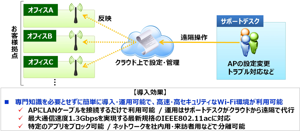 Cisco Merakiをアクセスポイントに採用し、クラウド経由で多彩な機能を提供。LANケーブルを接続するだけで利用可能で、設定変更などの運用代行サービスも提供