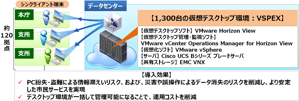 今回の導入は、東日本大震災を踏まえ、災害時においても初動対応の土台であるICT資源を活用できるようにする、ICT-BCP(ICT部門の業務継続計画)の一環でもあります。さらに、この仮想デスクトップ基盤には、事前検証済みパッケージであるEMC「VSPEX」を採用することで初期投資コストと運用コストを削減しています。