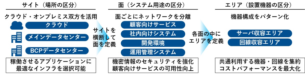 各「面」は、場所の区分である3種類の「サイト」(メインデータセンター、BCPデータセンター、クラウド)を横断して接続されています。これによって、稼働させるアプリケーションの性質に応じて、オンプレミス・クラウドから最適なインフラを選択可能にしています。