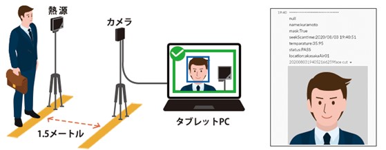 本ソリューションは、1)マスク着用時でも高精度な顔認証、2)非接触で誤差の少ない温度測定、3)迅速な情報共有、をコンセプトとして以下の機能を提供し、企業・病院・自治体などの入口に設置することで従業員や職員の発熱の可能性を検知して感染拡大リスクを軽減します。