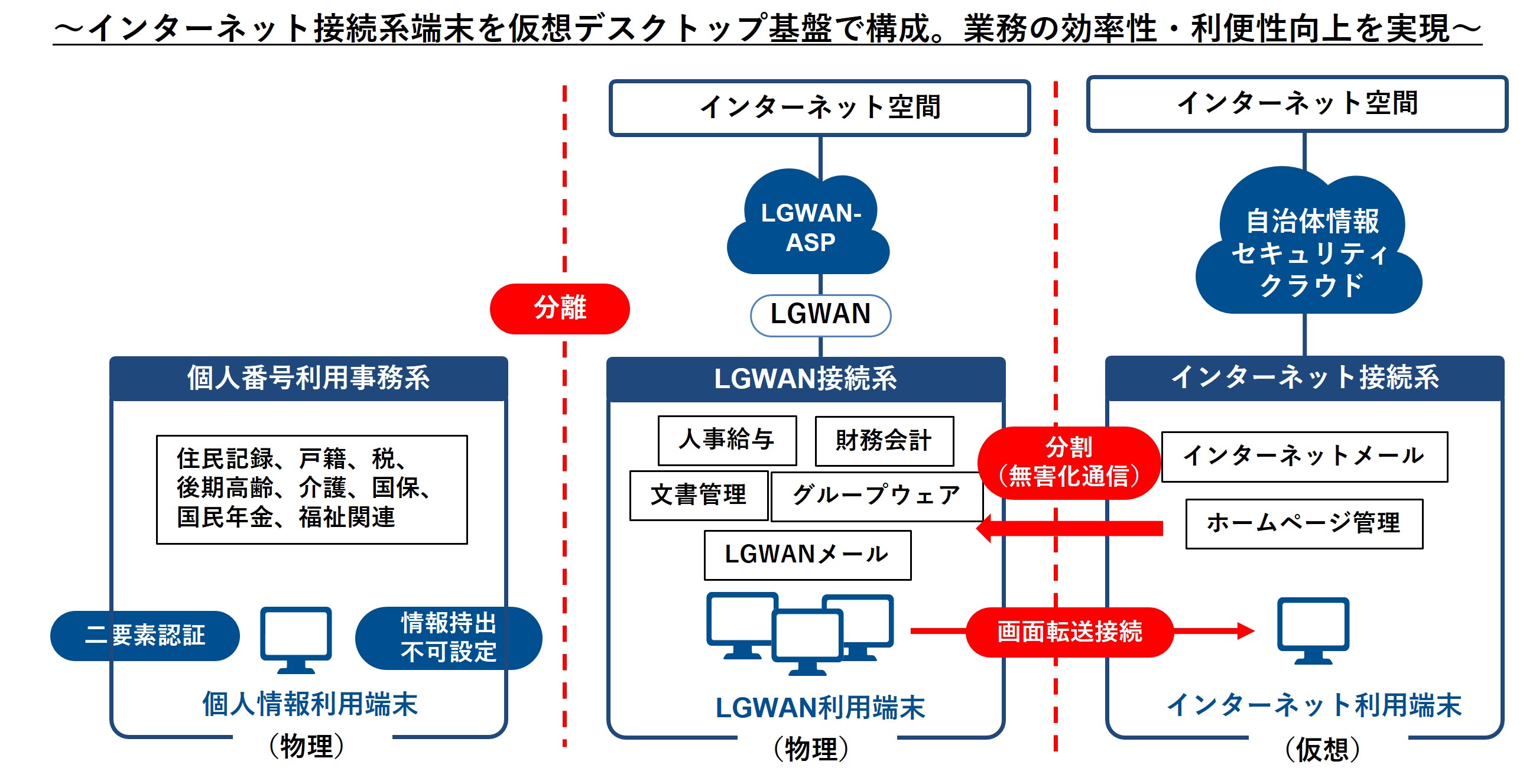 本基盤の特長は、インターネット接続系端末において「VDI(Virtual Desktop Infrastructure)方式」を利用することで、業務の効率性・利便性向上を図っている点です。