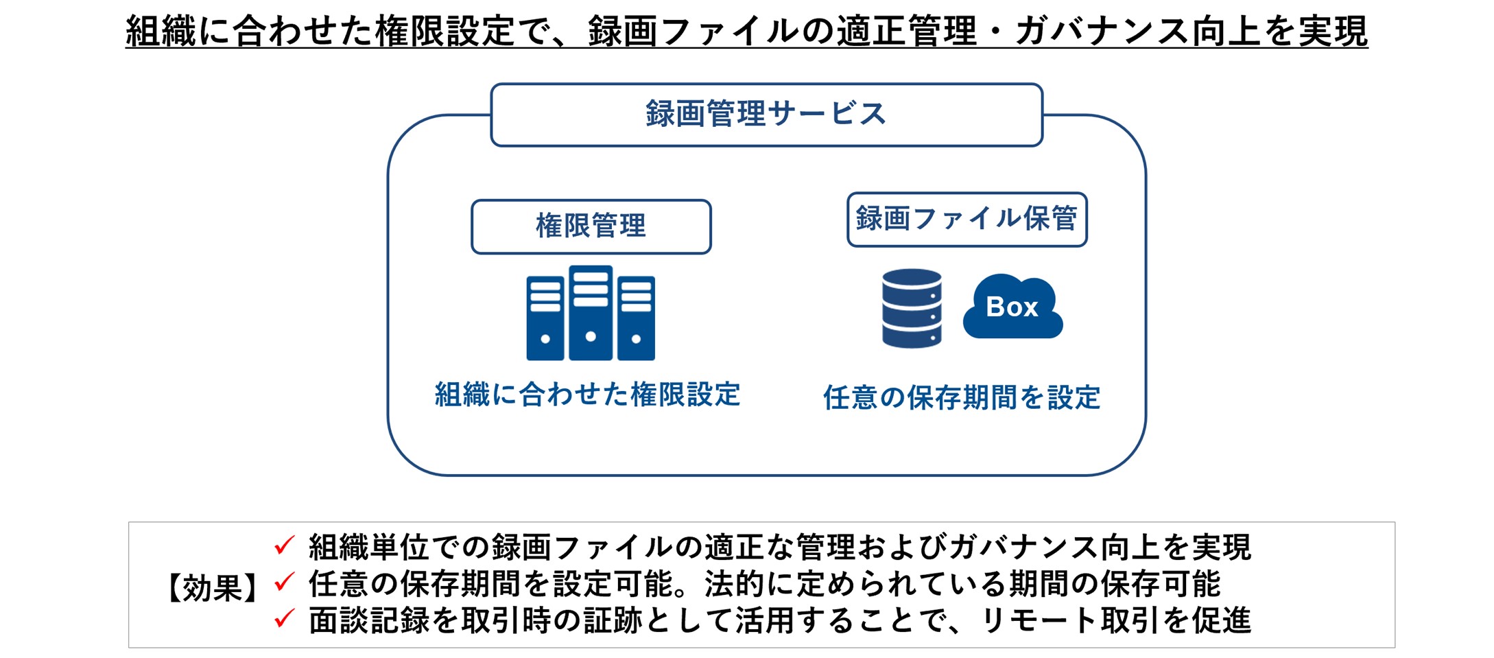 Webex Meetingsから取得した録画ファイルは「Box」に保存し、任意の保存期間を設定することができ、取引記録を法的に定められている期間で保存することが可能です。さらに、録画した面談記録を取引時の証跡として活用することで、従来必要だった申込書への署名や捺印が原則不要となり、リモートでの取引を促進することができます。