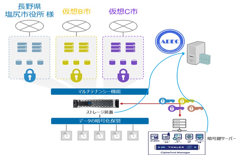 対象: 株式会社電算様のデータセンターにネットアップの検証用ストレージを設置し、仮想の塩尻市様、仮想B市などのテナントを構築し仮想住民データを格納。暗号化鍵の管理と消去を実施
