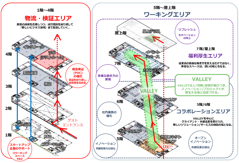 これまで、当社では機能ごとに拠点が分散しており、コロナ禍以前からリモートワークの働き方を取り入れてきたことから、社員がお互いにどのような課題意識を持ち、悩んでいるのかを共有しづらい状況にありました。この経験を経て、アイデアやイノベーションの創出、企業文化醸成や理念浸透には、社員同士が密なコミュニケーションを取ることができる環境づくりが必要だと改めて認識しました。本施設では、社員同士の様々な活動を促す「V-HALL」、「PARK」、「OPEN LOUNGE」などの場を設けることでコミュニケーションを活性化し、社員同士の相互理解から組織の一体感を醸成します。