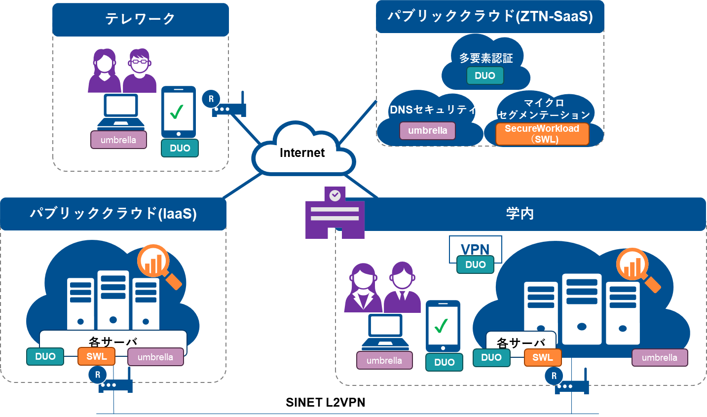危険サイトや利用禁止サイトなどへのアクセスを制御し、インターネット上の脅威からユーザーを保護する「Cisco Umbrella」を導入することで、学内、学外からの利用場所を問わず、あらゆるインターネットアクセスを保護し、高度なセキュリティを確保します。