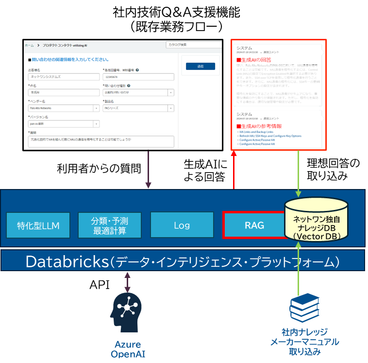 また、今回の開発にあたっては、生成AI開発に関してナレッジを多く持つ、データ&AIカンパニー Databricks Inc.(本社:米国カリフォルニア州サンフランシスコ、CEO:アリ・ゴディシ、以下 Databricks社)の開発支援サービス「Delivery Solution Architect」、「Professional Services」を利用しました。業務への効果が高い順に実装計画をたて、設計、実装およびLLMOps(大規模言語モデル運用)の仕組みづくりをDatabricks社の「データ・インテリジェンス・プラットフォーム」上で行ったことにより、わずか3ヶ月で本番環境として社内リリースを実現しました。