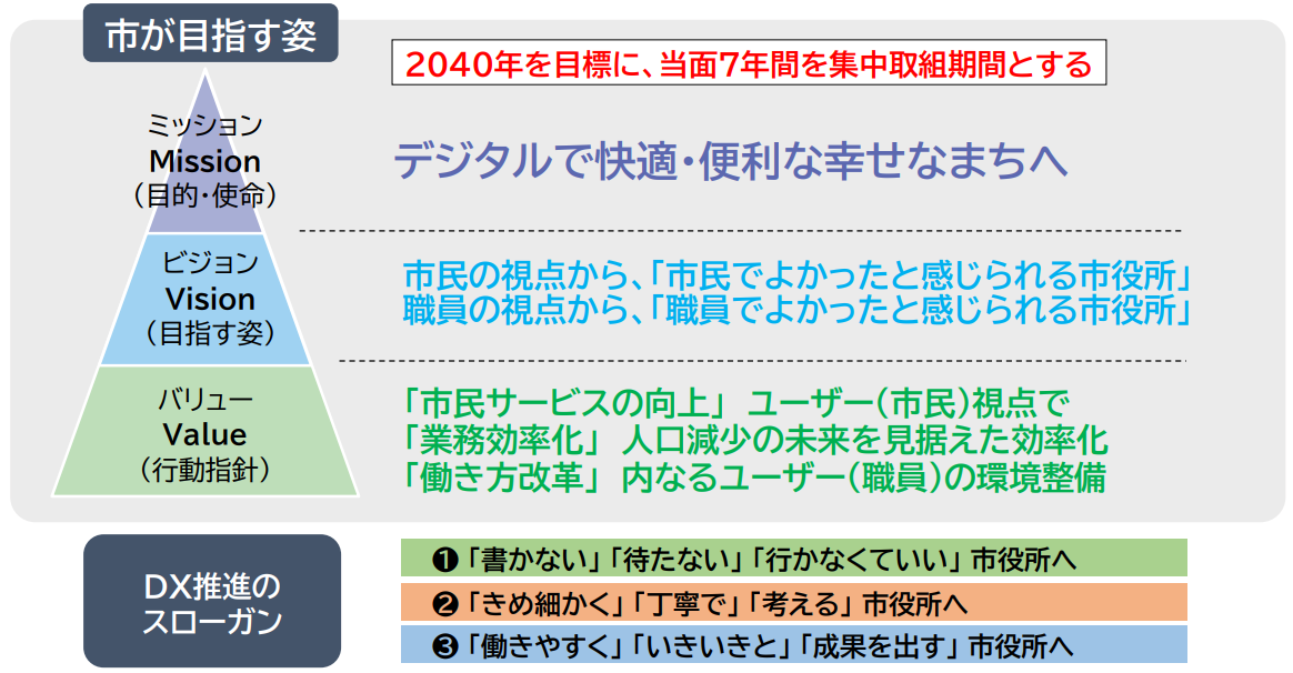 北九州市では、「デジタルで快適・便利な幸せなまち」の実現を目指して、令和3年12月に「北九州市DX推進計画(第1期:令和3年12月から令和7年度末)」を策定し、北九州市における自治体DX(デジタルトランスフォーメーション)の推進に取り組んできました。
