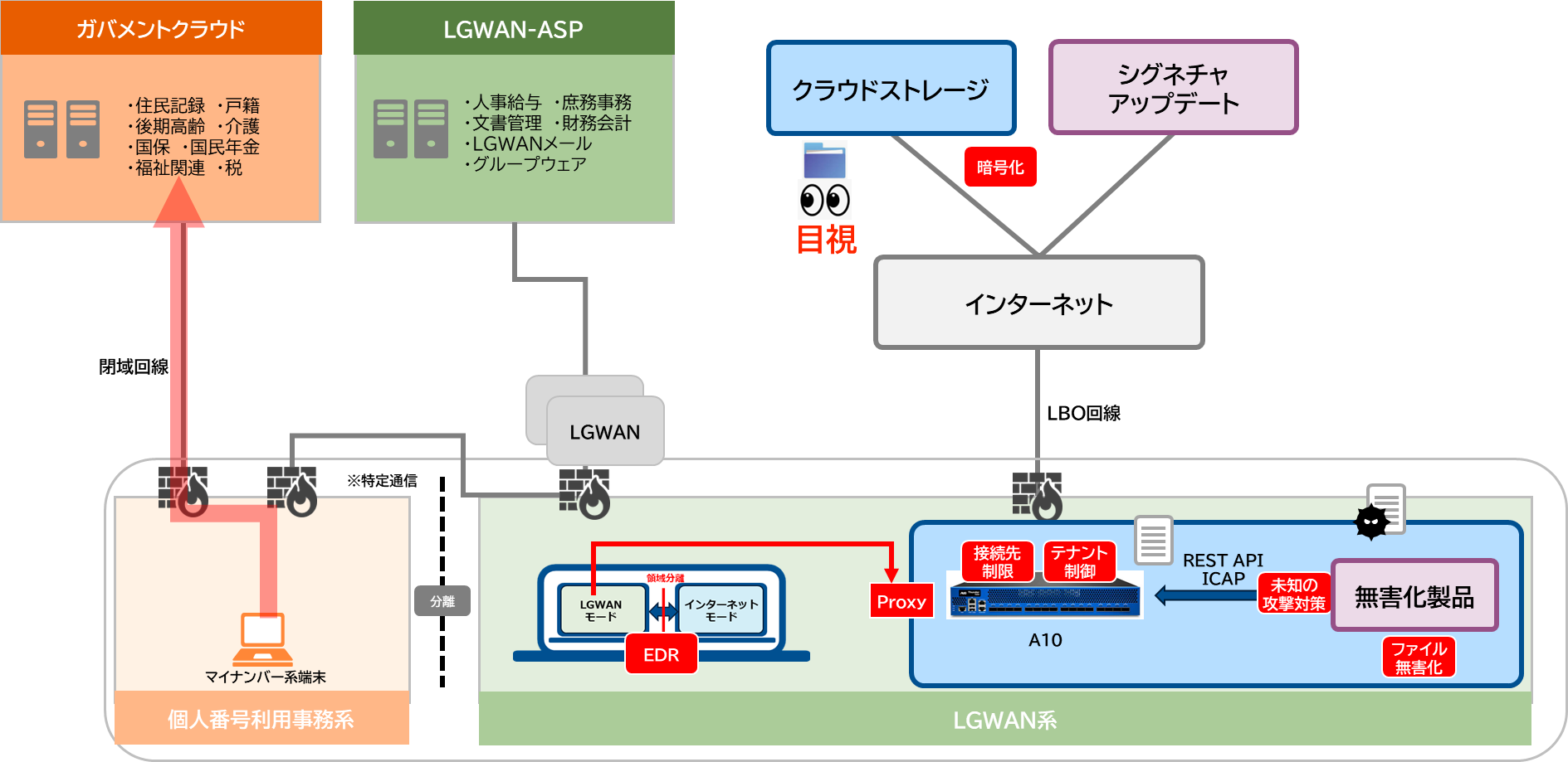 具体的には、α'モデル構成において、LGWAN接続系端末(物理)からProxyサーバ(製品名:A10 Thunder)を介し、クラウドストレージ(ブラウザ)上のファイルダウンロードが無害化通信(サニタイズ、Sandbox)として処理可能であることを確認しています。