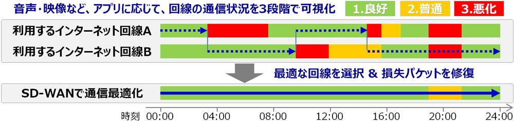 アプリケーションに最適な回線をリアルタイムで自動選択し、通信品質を最適化。ICTシステムのレスポンスを向上させ、WANのコスト・開通時間・運用負荷も劇的に改善