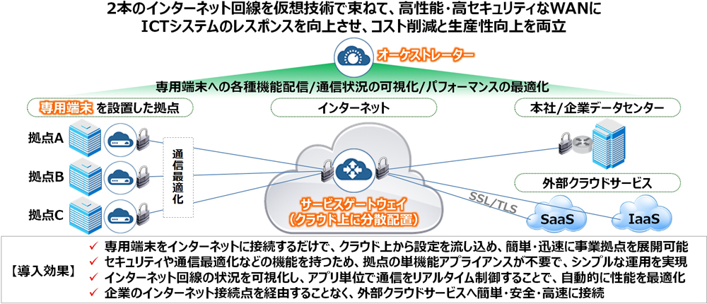これによって本サービスの導入企業は、閉域網WANサービスと比べてICTシステムのレスポンスを向上させるとともに、WANのコスト・開通時間・運用負荷も劇的に改善することが可能です。