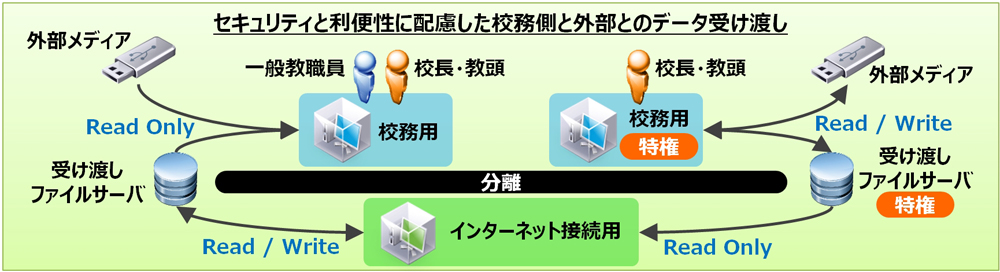 - 行事写真などの外部メディアデータを安全に利用するため、一般教職員はデータ読み込みのみを許可し、校長・教頭の許可なしでは外部メディアにデータを書き込みできない仕組みに