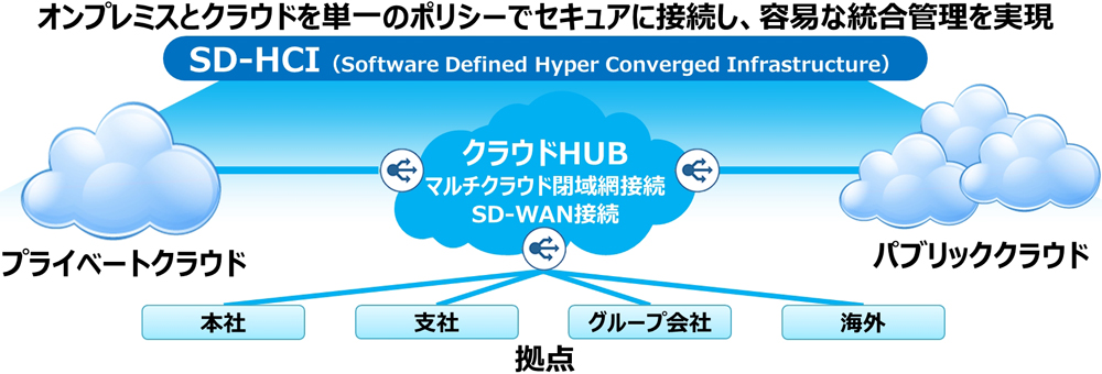 SD-WAN機能:迅速・柔軟でクラウド活用に適した拠点間WANを実現する、各事業拠点とプライベートクラウド/パブリッククラウド間の仮想ネットワークの提供と統合管理