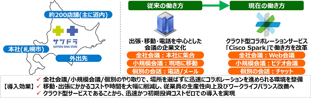 働き方改革に向けて、サッポロドラッグストアーがクラウド型コラボレーションサービス「Cisco Spark」を採用。北海道を中心とした約200店舗と本社間の会議を効率化