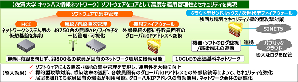 これによって佐賀大学は、各種機器や機能をソフトウェアで集中管理することによる運用性の大幅な向上に加えて、標的型攻撃対策を含めたセキュリティの強化を実現しました。