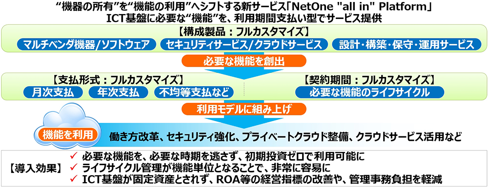 ネットワンシステムズ株式会社(本社:東京都千代田区、代表取締役 社長執行役員:吉野 孝行)は、"機器の所有"を"機能の利用"へシフトする新サービス「NetOne “all in” Platform」を、本日より提供開始します。