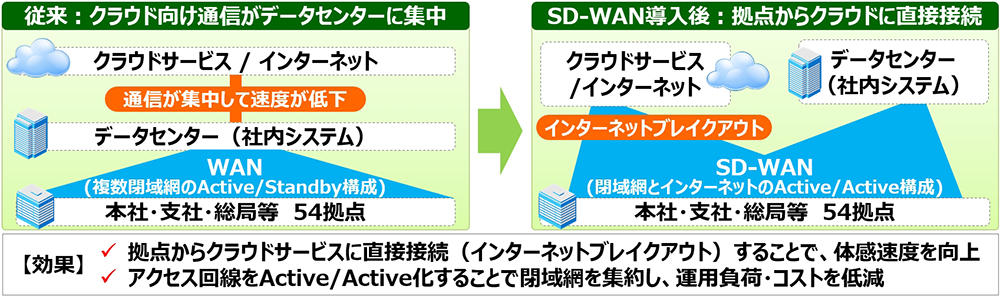 本環境では、本社・支社・総局等の全国54拠点から、直接インターネットへ安全に接続する「インターネットブレイクアウト」を実現しています。