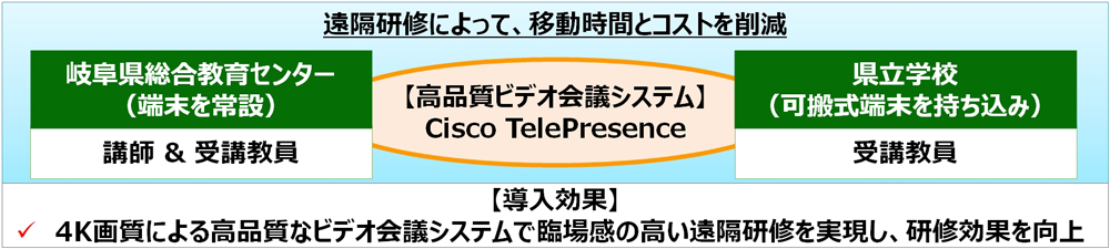 また一方で、岐阜県教育委員会が実施している教員研修において、従来から、移動時間とコスト削減のために、研修会場の岐阜県総合教育センターと県立学校を結ぶビデオ会議システムによる遠隔研修を実施していました。ここで、研修効果をより一層高めるために、ビデオ会議システムの画質・音質向上を課題としていました。