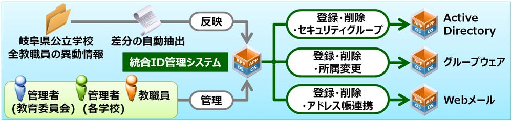 統合ID管理においては、教職員の人事異動情報から、既存情報との差分を自動抽出してID管理基盤に反映する仕組みを整備しています。このIDをグループウェア・Webメール・Active Directory等と自動的に連携させることで、管理者の負荷軽減と、利用者の利便性向上を実現しています。