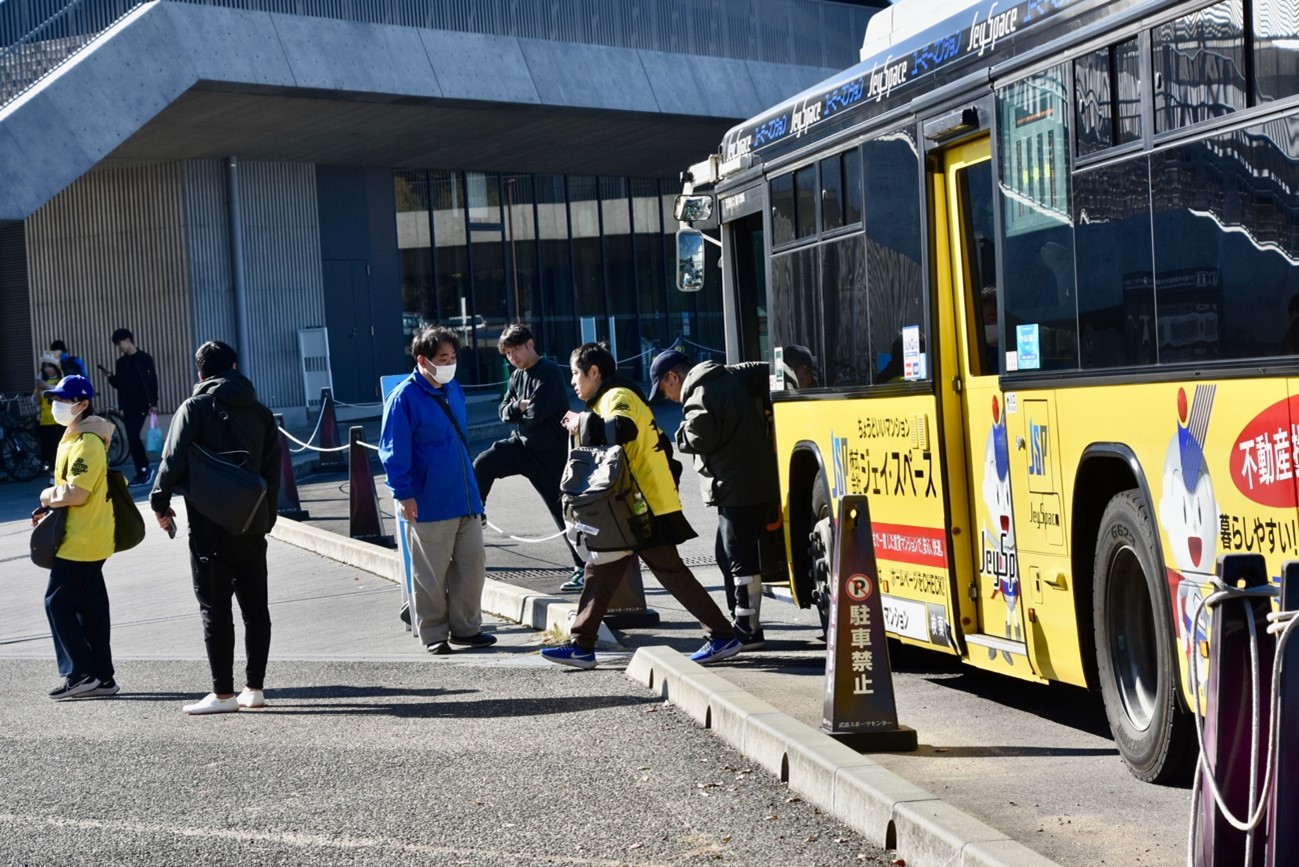 サステナウォーキングと同じように、CO2削減を目指し大分駅からスタジアムまでを専用のシャトルバスを利用する取り組み。バスの車内はニータンやフラッグで飾られた特別仕様でしたが、千葉から来たサポーターも多く利用していました!