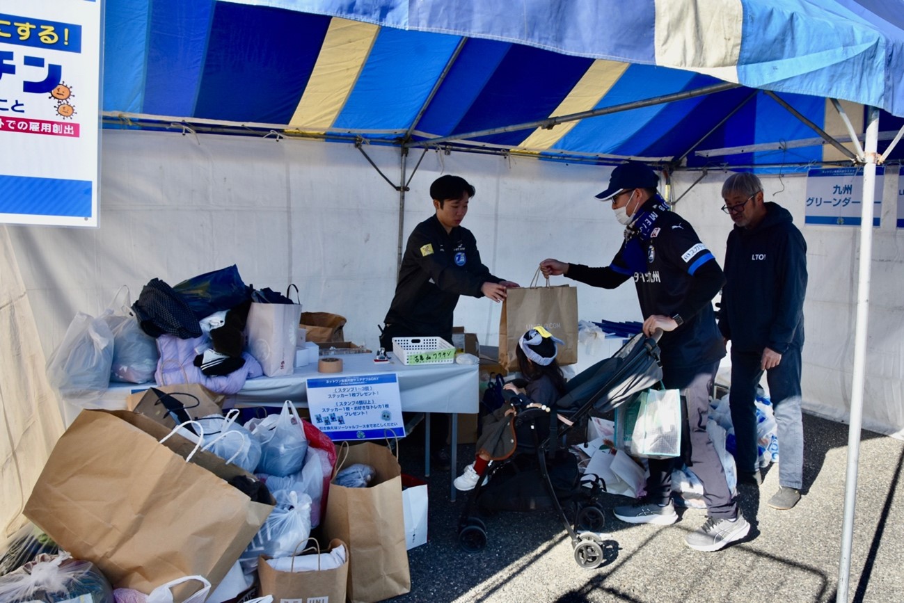 昨年も実施されたこのプロジェクトは、使わなくなった応援グッズを新規のサポーターへ継承することでリユースを促進する取り組み。ブースには、タオルマフラーやTシャツなど多くの衣類が寄せられました!寄付されてから新規の方へ渡るスピードも早く、手にした人は早速身に付けながら、みんな笑顔でスタジアムへ向かいました。