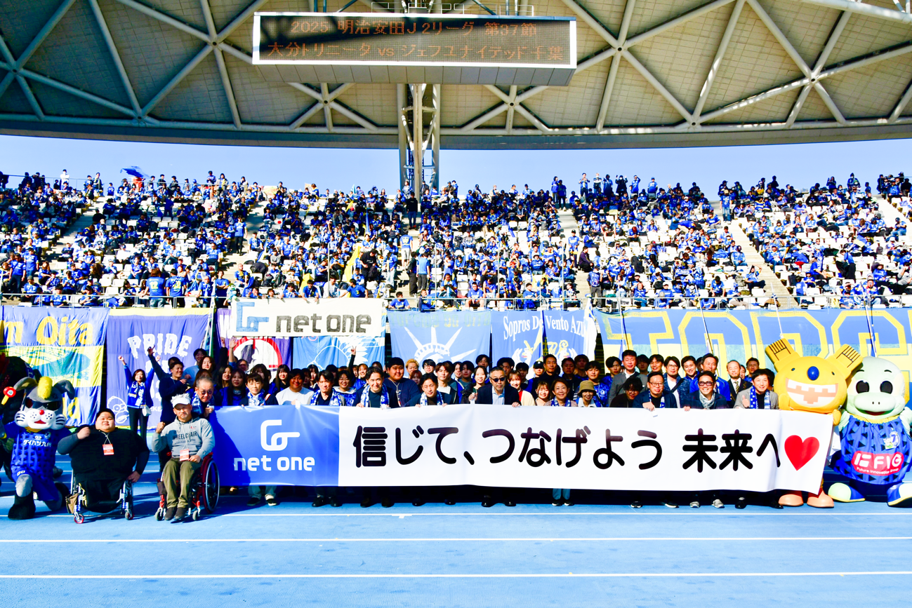 キックオフ前には、竹下隆史代表取締役社長からサポーターへ向けての挨拶。そして、竹下社長とネットワンパートナーズ株式会社田中拓也社長がキックインセレモニーを行いました。竹下社長は、千葉から1,000人以上駆けつけたジェフサポーターへ、そしてJ2残留を決める大事な一戦を迎えたトリニーターサポーターへ熱いメッセージが送られました。また大分市佐賀関の大規模火災についても触れ、会場からは多くの拍手とネットワンコールが響きました。