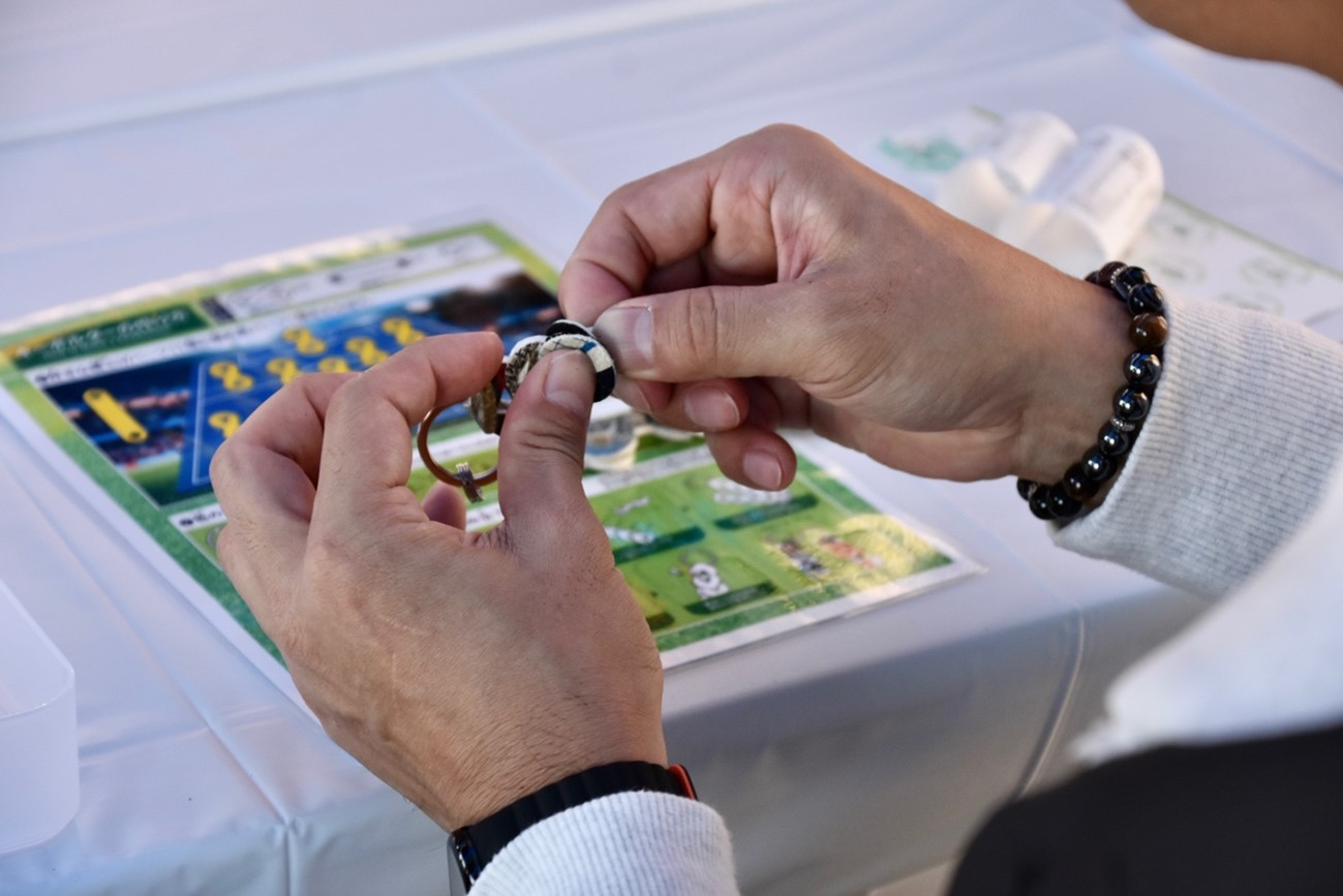 実際に大分トリニータのトップチーム、アカデミーの選手たちが使用した後、破棄される予定だったサッカーボールをアップサイクルし、世界に一つだけのオリジナルキーホルダーを作りました。通常なら捨てられてしまう物が再生され、誰かの大切な何かになることで子どもたちも環境問題に対する意識が深まります。その意識の変化が持続可能な好循環を生み出すことにつながるという帝京大学の学生たちの思いが詰まった企画。大分サポーターはもちろん、対戦相手である千葉サポーターの方も多く訪れ、興味を持って参加してくれました!キーホルダーが完成すると、嬉しそうにバッグに付け変える姿が印象的でした♫